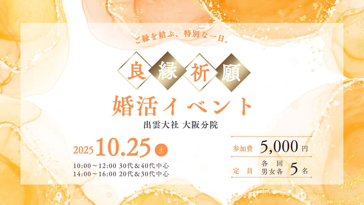 | イベント名 | ご祈祷×婚活イベント!縁結びの聖地・出雲大社大阪分院で出会う特別な一日 |