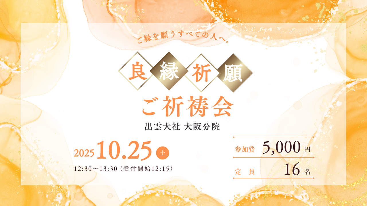| イベント名 | 日本一の縁結び神社のご利益を大阪で!良縁祈願・ご祈祷会 |